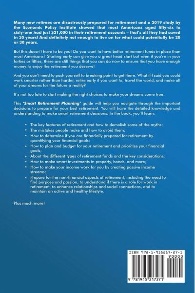 Let's put that into perspective: You could have 20-30 years of life left to enjoy after retirement - and exciting a prospect as that is, you're only going to enjoy it if you can afford to live the life you want to lead. This no-nonsense guide to realistic and savvy retirement planning has you covered Written in simple, easy-to-understand language that sifts out all the jargon, it's the only resource you'll need to whip your finances into shape and pave the way for a happy and fulfilling retirement. Inside, you'll discover:Retirement demystified The top mistakes most people make with retirement planning - and how you can avoid them The nitty gritty - a clear guide to planning and budgeting for your retirement How to strike the balance between risk and reward Everything you need to know about investment The art of making your money work for you (as it should when you've worked this hard to earn it) - plus what the banks don't want you to know about saving What it really means to earn a passive income - and why it's a more viable option than you realized Key tips for all income brackets The bit no one wants to think about... how to plan for any potential care you may need in the future Retirement hacks for savvy planners - yes, you! And much more.