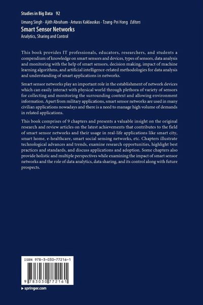 This book provides IT professionals, educators, researchers, and students a compendium of knowledge on smart sensors and devices, types of sensors, data analysis and monitoring with the help of smart sensors, decision making, impact of machine learning algorithms, and artificial intelligence-related methodologies for data analysis and understanding of smart applications in networks.