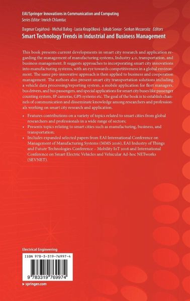 This book presents current developments in smart city research and application regarding the management of manufacturing systems, Industry 4.0, transportation, and business management. It suggests approaches to incorporating smart city innovations into manufacturing systems, with an eye towards competitiveness in a global environment. The same pro-innovative approach is then applied to business and cooperation management. The authors also present smart city transportation solutions including vehicle data processing/reporting system, mobile application for fleet managers, bus drivers, bus passengers and special applications for smart city buses like passenger counting system, IP cameras, GPS system etc. The goal of the book is to establish channels of communication and disseminate knowledge among researchers and professionals working on smart city research and application.