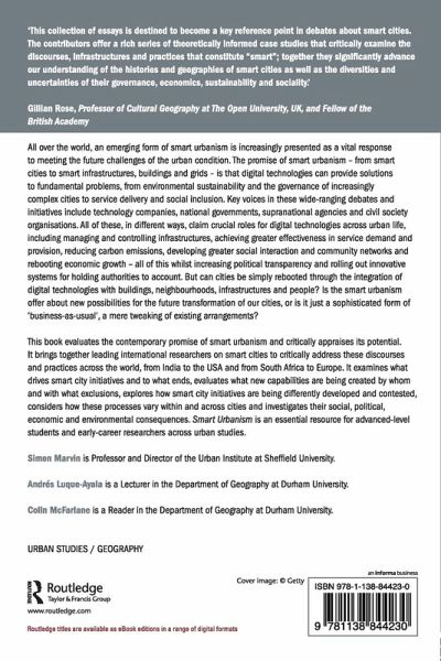Smart Urbanism (SU) - the rebuilding of cities through the integration of digital technologies with buildings, neighbourhoods, networked infrastructures and people - is being represented as a unique emerging 'solution' to the majority of problems faced by cities today. SU discourses, enacted by technology companies, national governments and supranational agencies alike, claim a supremacy of urban digital technologies for managing and controlling infrastructures, achieving greater effectiveness in managing service demand and reducing carbon emissions, developing greater social interaction and community networks, providing new services around health and social care etc. Smart urbanism is being represented as the response to almost every facet of the contemporary urban question. This book explores this common conception of the problematic of smart urbanism and critically address what new capabilities are being created by whom and with what exclusions; how these are being developed - and contested; where is this happening both within and between cities; and, with what sorts of social and material consequences. The aim of the book is to identify and convene a currently fragmented and disconnected group of researchers, commentators, developers and users from both within and outside the mainstream SU discourse, including several of those that adopt a more critical perspective, to assess 'what' problems of the city smartness can address The volume provides the first internationally comparative assessment of SU in cities of the global north and south, critically evaluates whether current visions of SU are able to achieve their potential; and then identifies alternative trajectories for SU that hold radical promise for reshaping cities.