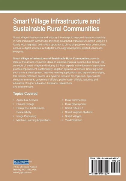 Smart village infrastructure and Industry 5.0 attempt to improve internet connectivity in rural and remote locations by delivering broadband infrastructure. Smart village is a locally led, integrated, and holistic approach to giving all people of rural communities access to digital services, with digital technology development-related services for everyone. Smart Village Infrastructure and Sustainable Rural Communities presents state-of-the-art and innovative ideas on empowering rural communities through the concepts of smart village and Industry 5.0 from experts in the domain of agriculture process improvement, sustainability, irrigation systems, and more. Covering topics such as rural development, machine learning applications, and agriculture analysis, this premier reference source is a dynamic resource for engineers, agronomists, computer scientists, government officials, public health officials, students and educators of higher education, librarians, researchers, and academicians.