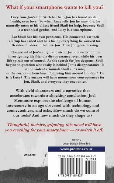 What if your smartphone wants to kill you? Lucy runs Jon's life. With her help Jon has found wealth, health, even love. So when Lucy tells Jon he must die, he naturally turns to his oldest friend Skull for help, because Skull is a technical genius, and Lucy is a smartphone. But Skull has his own problems. His connected-car tech startup has failed and he’s losing everything he worked for. Besides, he doesn't believe Jon. Then Jon goes missing. The arrival of Jon's enigmatic sister Jac, draws Skull into investigating his friend’s disappearance, even while his own life spirals out of control. As the search for Jon deepens, Skull begins to question who really is behind Jon’s disappearance. Is it the violent criminals Skull runs into, or the corporate henchmen following him around London? Or is it Lucy? The answer will have momentous consequences for Jon, Skull, and everyone they encounter. With vivid characters and a narrative that accelerates towards a shocking conclusion, Joel Mentmore exposes the challenge of human intercourse in an age obsessed with technology and connectedness, and asks, How much do we control our tools? And how much do they shape us? Thoughtful, incisive, gripping, this novel will have you reaching for your smartphone — to switch it off.