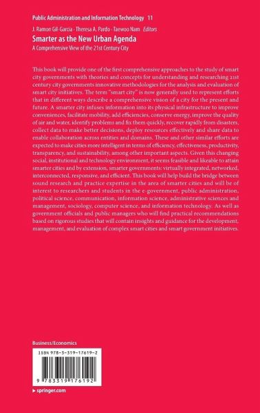 This book will provide one of the first comprehensive approaches to the study of smart city governments with theories and concepts for understanding and researching 21st century city governments innovative methodologies for the analysis and evaluation of smart city initiatives. The term "smart city" is now generally used to represent efforts that in different ways describe a comprehensive vision of a city for the present and future. A smarter city infuses information into its physical infrastructure to improve conveniences, facilitate mobility, add efficiencies, conserve energy, improve the quality of air and water, identify problems and fix them quickly, recover rapidly from disasters, collect data to make better decisions, deploy resources effectively and share data to enable collaboration across entities and domains. These and other similar efforts are expected to make cities more intelligent in terms of efficiency, effectiveness, productivity, transparency, and sustainability, among other important aspects. Given this changing social, institutional and technology environment, it seems feasible and likeable to attain smarter cities and by extension, smarter governments: virtually integrated, networked, interconnected, responsive, and efficient. This book will help build the bridge between sound research and practice expertise in the area of smarter cities and will be of interest to researchers and students in the e-government, public administration, political science, communication, information science, administrative sciences and management, sociology, computer science, and information technology. As well as government officials and public managers who will find practical recommendations based on rigorous studies that will contain insights and guidance for the development, management, and evaluation of complex smart cities and smart government initiatives.
