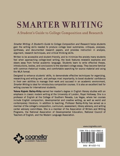 Smarter Writing: A Student's Guide to College Composition and Research helps students gain the writing skills needed to produce college level summaries, critiques, analyses, syntheses, and documented research papers, and provides instruction in analysis, argument, research techniques, and critical thinking skills. Written to be accessible and student-friendly, and to minimize the anxiety many students feel when approaching college-level writing, the book features relatable examples and steers away from formal academic language. Students learn to write effective theses, introductions, bodies, and conclusions to the standard college essay. They become familiar with common rhetorical modes, and comfortable searching for source material and using the MLA format. Designed to enhance students' skills, to demonstrate effective techniques for organizing, researching and writing well, and perhaps most importantly, to boost students' confidence in their own abilities to manage their work and succeed in an academic environment, Smarter Writing is ideal for introductory composition courses. It is also an excellent text for writing courses for international students. Yelena Kajevic Bailey-Kirby earned her master’s degree in English literary studies with an emphasis in classic modern writing at the University of London, Royal Holloway. She is a professor of English at the College of Southern Nevada, Las Vegas, where her courses include English composition, developmental and creative writing, as well as world and contemporary literature. In addition to teaching, Professor Bailey-Kirby has served as a member of the college’s composition, curriculum, assessment, library advisory, and writing center advisory committees. She is a member of the Association of Writers and Writing Programs, the National Association of Developmental Education, National Council of Teachers of English, and the Modern Language Association.