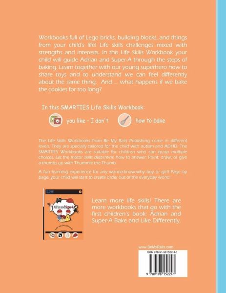 The Adrian and Super-A Life Skills Workbooks are full of Lego bricks, building blocks, and things from your child's life! Find Life skills challenges mixed with a child's strengths and interests. In this SMARTIES Workbook, your child will guide Adrian and Super-A through the steps of baking. Learn together with our young superhero how to share toys and to understand that we can feel differently about the same thing. And ... what happens if we bake the cookies for too long? The colorful everyday situations and familiar book characters will engage any wanna-know-why boy or girl! For more fun learning, cut out the small memory game or bake coconut macaroons with the picture recipe inside! The workbooks are specially tailored for the children with autism and ADHD, as well as their strengths and difficulties. The exercises will help develop your child's executive functions and theory of mind by teaching even a young child to think in steps and understand how others feel. Parents as well as kindergarten or special education teachers can use the STARTERS Workbooks for children three years and up. The SMARTIES Workbooks are suitable for children who can grasp multiple choices at once. Let the motor skills determine how to answer: Point, draw, or give a thumbs up with Thummie the Thumb. This workbooks builds on the life skills from the book Adrian and Super-A Bake and Like Differently