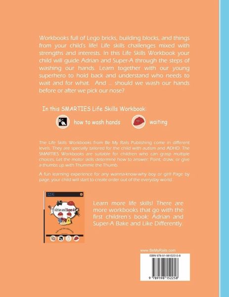 The Adrian and Super-A Life Skills Workbooks are full of Lego bricks, building blocks, and things from your child's life! Find Life skills challenges mixed with a child's strengths and interests. In this SMARTIES Workbook, your child will guide Adrian and Super-A through the steps of washing our hands. Learn together with our young superhero to hold back and understand who needs to wait and for what. And ... should we wash our hands before or after we pick our nose? The colorful everyday situations and familiar book characters will engage any wanna-know-why boy or girl! And for more fun learning, cut out the small memory game and Thummie the Thumb with the Wait-cards! The workbooks are specially tailored for the children with autism and ADHD, as well as their strengths and difficulties. The exercises will help develop your child's executive functions and theory of mind by teaching even a young child to think in steps and understand how others feel. Parents as well as kindergarten or special education teachers can use the STARTERS Workbooks for children three years and up. The SMARTIES Workbooks are suitable for children who can grasp multiple choices at once. Let the motor skills determine how to answer: Point, draw, or give a thumbs up with Thummie the Thumb. This workbooks builds on the life skills from the book Adrian and Super-A Bake and Like Differently.