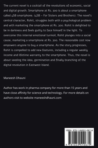 The current novel is a cocktail of the revolutions of economic, social and digital growth. Smartphone at Rs. 300 is about a smartphone called 4SB smartphone. (4SB - For Sisters and Brothers). The novel's central character, Rohit, struggles both with a psychological problem and with marketing the smartphone at Rs. 300. Rohit is delighted to be in darkness and feels guilty to face himself in the light. To overcome this internal emotional turmoil, Rohit plunges into a social cause, marketing a smartphone at Rs. 300. The reasonable cost now empowers anyone to buy a smartphone. As the story progresses, Rohit is compelled to add new features, including a regular weekly income and lifetime warranty to the smartphone. Thus, the novel is about seeding the idea, germination and finally branching of the digital revolution in Eastwest Island.