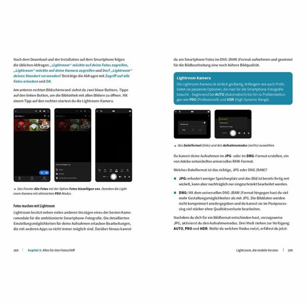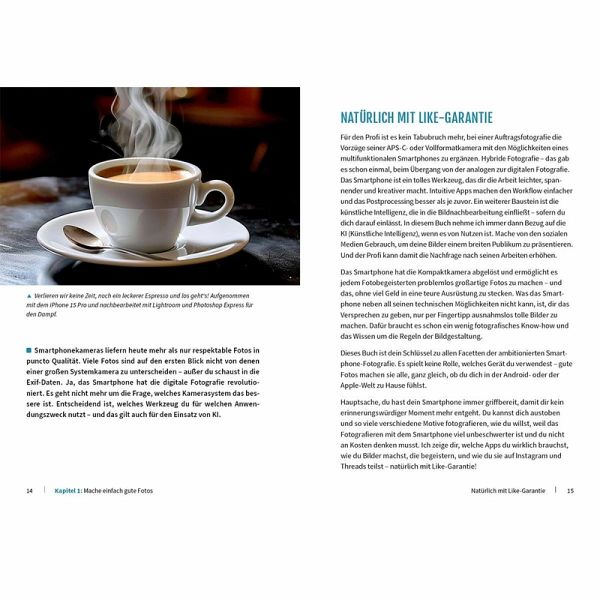 Aus dem Inhalt: Deine Smartphone-Kamera im Griff Fokussiere und belichte richtig Spiele mit Licht und Schatten Ideen: Kreativität braucht Raum Beste Tageszeit für magische Fotos Die besten Apps für den Feinschliff Dreh- und Angelpunkt Lightroom Luminar Mobile mit intuitiver KI Fotos auf dem Smartphone pimpen Video: Hollywood lässt grüßen Spannende Spielereien mit KI Endlich Durchblick im Bildarchiv Deine Bühne: Instagram & Threads
