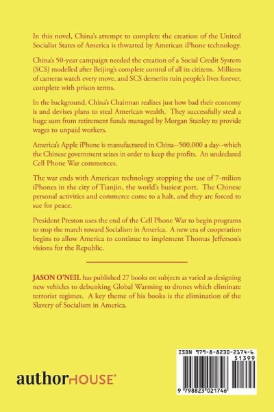 In this novel, China's attempt to complete the creation of the United Socialist States of America is thwarted by American iPhone technology. China's 50-year campaign needed the creation of a Social Credit System (SCS) modelled after Beijing's complete control of all its citizens. Millions of cameras watch every move, and SCS demerits ruin people's lives forever, complete with prison terms. In the background, China's Chairman realizes just how bad their economy is and devises plans to steal American wealth. They successfully steal a huge sum from retirement funds managed by Morgan Stanley to provide wages to unpaid workers. America's Apple iPhone is manufactured in China--500,000 a day--which the Chinese government seizes in order to keep the profits. An undeclared Cell Phone War commences. The war ends with American technology stopping the use of 7-milion iPhones in the city of Tianjin, the world's busiest port. The Chinese personal activities and commerce come to a halt, and they are forced to sue for peace. President Preston uses the end of the Cell Phone War to begin programs to stop the march toward Socialism in America. A new era of cooperation begins to allow America to continue to implement Thomas Jefferson's visions for the Republic.
