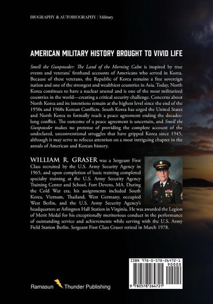 This book is non-fiction, and is a comprehensive account of the undeclared, unconventional struggles that have gripped Korea since 1945. AMERICAN MILITARY HISTORY BROUGHT TO VIVID LIFESmell the Gunpowder: The Land of the Morning Calm is inspired by true events and veterans' firsthand accounts of Americans who served in Korea. Because of these veterans, the Republic of Korea remains a free sovereign nation, and one of the strongest and wealthiest countries in Asia.American military in Korea began from the end of World War II through the Cold War to include two Korean Conflicts (1950-1953) and (1966-1969). Smell the Gunpowder: The Land of the Morning Calm continues with the Singapore Summit 2018 (Singapore), the Hanoi Summit 2019 (Socialist Republic of Vietnam), North Korea's hostile threat of nuclear conflict along with the economic and social impact of the coronavirus pandemic Today, North Korea continues to have a nuclear arsenal and is one of the most militarized countries in the world creating a critical security challenge. Concerns about North Korea and its intentions remain at the highest level since the end of the 1950s and 1960s Korean Conflicts. South Korea has urged the United States and North Korea to reach a formal peace agreement to end the decades-long conflict, but the outcome of a peace agreement is uncertain.Perfect for the historian, librarian, student of history, veterans, and readers with an interest in military events. Smell the Gunpowder offers a unique firsthand account of our servicemen's difficulties and struggles. ABOUT THE AUTHORWilliam R. Graser, U.S. Army (Ret) was a Sergeant First Class recruited by the U.S. Army Security Agency in 1965, and during the Cold War era, his assignments included South Korea.On November 2, 1966, the second Korean conflict began, and author William R. Graser was assigned to a U.S. Army camp on the Korean Demilitarized Zone (DMZ). Smell the Gunpowder: The Land of the Morning Calm includes the story of his time there, as well as how that experience carried his life forward through to present day.
