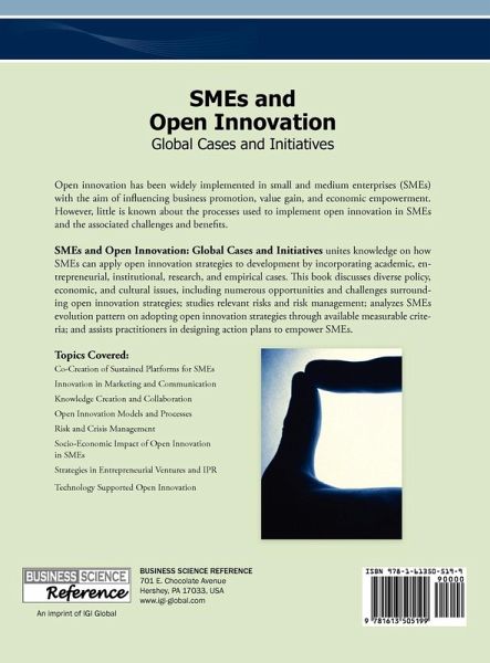 Open innovation has been widely implemented in small and medium enterprises (SMEs) with the aim of influencing business promotion, value gain, and economic empowerment. However, little is known about the processes used to implement open innovation in SMEs and the associated challenges and benefits. SMEs and Open Innovation: Global Cases and Initiatives unites knowledge on how SMEs can apply open innovation strategies to development by incorporating academic, entrepreneurial, institutional, research, and empirical cases. This book discusses diverse policy, economic, and cultural issues, including numerous opportunities and challenges surrounding open innovation strategies; studies relevant risks and risk management; analyzes SMEs evolution pattern on adopting open innovation strategies through available measurable criteria; and assists practitioners in designing action plans to empower SMEs.