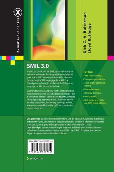 SMIL 3.0: Multimedia for the Web, Mobile Devices and Daisy Talking Books is a revised introduction to - and resource guide for - the W3C SMIL language. It covers all aspects of the SMIL specification and covers all of SMIL's implem- tation profiles, from the desktop through the world of mobile SMIL devices. Based on the first version of the book, which covered SMIL 2.0, this edition has been updated with information from the past two releases of the SMIL l- guage. We have benefitted from comments and suggestions from many readers of the first edition, and have produced what we feel is the most comprehensive guide to SMIL available anywhere. Motivation for this Book While we were working on various phases of the SMIL recommendations, it became clear to us that the richness of the SMIL language could easily ov- whelm many Web authors and designers. In the 500+ pages that the SYMM working group needed to describe the 30+ SMIL elements and the 150+ SMIL attributes, there was not muchroom for background information or extensive examples. The focus of the specification was on implementation aspects of the SMIL language, not on the rationale or the potential uses of SMIL's declarative power.