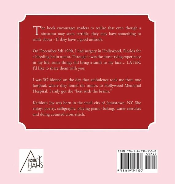 The book encourages readers to realize that even though a situation may seem terrible, they may have something to smile about - If they have a good attitude. On December 5th, 1990, I had surgery in Hollywood, Florida for a bleeding brain tumor. Through it was the most trying experience in my life, some things did bring a smile to my face . . . LATER. I'd like to share them with you. I was SO blessed on the day that ambulance took me from one hospital, where they found the tumor, to Hollywood Memorial Hospital. I truly got the "best with the brains".