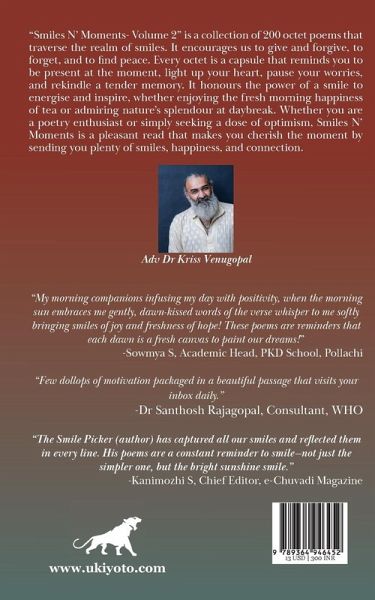 "Smiles N' Moments- Volume 2" is a collection of 200 octet poems that traverse the realm of smiles. It encourages us to give and forgive, to forget, and to find peace. Every octet is a capsule that reminds you to be present at the moment, light up your heart, pause your worries, and rekindle a tender memory. It honours the power of a smile to energise and inspire, whether enjoying the fresh morning happiness of tea or admiring nature's splendour at daybreak. Whether you are a poetry enthusiast or simply seeking a dose of optimism, Smiles N' Moments is a pleasant read that makes you cherish the moment by sending you plenty of smiles, happiness, and connection.