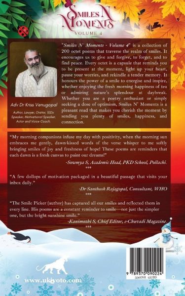"Smiles N' Moments- Volume 4" is a collection of 200 octet poems that traverse the realm of smiles. It encourages us to give and forgive, to forget, and to find peace. Every octet is a capsule that reminds you to be present at the moment, light up your heart, pause your worries, and rekindle a tender memory. It honours the power of a smile to energise and inspire, whether enjoying the fresh morning happiness of tea or admiring nature's splendour at daybreak. Whether you are a poetry enthusiast or simply seeking a dose of optimism, Smiles N' Moments is a pleasant read that makes you cherish the moment by sending you plenty of smiles, happiness, and connection.