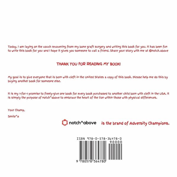 A cleft adventure from birth to nine written by a boy born with cleft.Hi, My name is Quin, my dad calls me Smile^z. Even though we look different, we should all be treated the same. I have two brothers "Zman", he's two years older than me and "A", he's my identical twin without cleft. I was born with a severe unilateral cleft lip and palate. Sometimes it is hard to make friends because people think I am ugly, but I think I am cool just because of the way I look. My dad taught me to face my differences and say, "I was born with my nose just like you were born with yours."I hope you enjoy my book. Your Champ, Smile^z