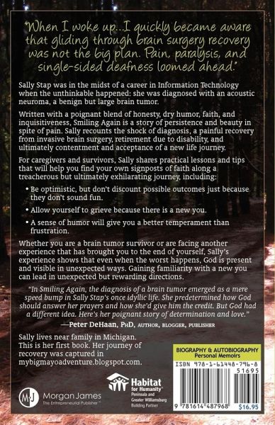 Smiling Again captures Sally's experience with the removal of a brain tumor and the recovery process. It captures her faith journey while navigating the crisis. She educates the reader on the specific disease and explains how a caregiver can support a patient throughout a medical crisis. Immediately following surgery, she captured her feeling in parallel with her blog while processing the changes in her life.