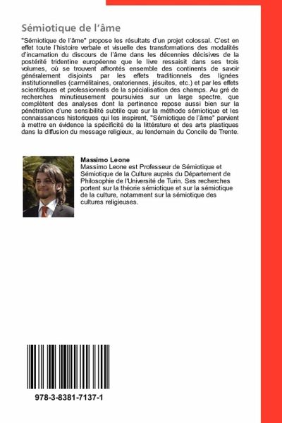 "Sémiotique de l âme" propose les résultats d un projet colossal. C est en effet toute l histoire verbale et visuelle des transformations des modalités d incarnation du discours de l âme dans les décennies décisives de la postérité tridentine européenne que le livre ressaisit dans ses trois volumes, où se trouvent affrontés ensemble des continents de savoir généralement disjoints par les effets traditionnels des lignées institutionnelles (carmélitaines, oratoriennes, jésuites, etc.) et par les effets scientifiques et professionnels de la spécialisation des champs. Au gré de recherches minutieusement poursuivies sur un large spectre, que complètent des analyses dont la pertinence repose aussi bien sur la pénétration d une sensibilité subtile que sur la méthode sémiotique et les connaissances historiques qui les inspirent, "Sémiotique de l âme" parvient à mettre en évidence la spécificité de la littérature et des arts plastiques dans la diffusion du message religieux, au lendemain du Concile de Trente.