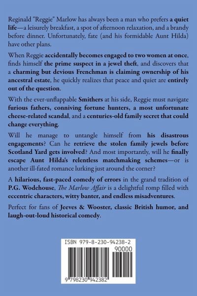 Reginald "Reggie" Marlow has always been a man who prefers a quiet life-a leisurely breakfast, a spot of afternoon relaxation, and a brandy before dinner. Unfortunately, fate (and his formidable Aunt Hilda) have other plans. When Reggie accidentally becomes engaged to two women at once, finds himself the prime suspect in a jewel theft, and discovers that a charming but devious Frenchman is claiming ownership of his ancestral estate, he quickly realizes that peace and quiet are entirely out of the question. With the ever-unflappable Smithers at his side, Reggie must navigate furious fathers, conniving fortune hunters, a most unfortunate cheese-related scandal, and a centuries-old family secret that could change everything. Will he manage to untangle himself from his disastrous engagements? Can he retrieve the stolen family jewels before Scotland Yard gets involved? And most importantly, will he finally escape Aunt Hilda's relentless matchmaking schemes-or is another ill-fated romance lurking just around the corner? A hilarious, fast-paced comedy of errors in the grand tradition of P.G. Wodehouse, The Marlow Affair is a delightful romp filled with eccentric characters, witty banter, and endless misadventures. Perfect for fans of Jeeves & Wooster, classic British humor, and laugh-out-loud historical comedy.