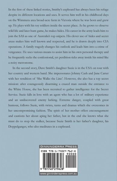 In the first of these linked stories, Smithy's cupboard has always been his refuge despite its different locations and uses. It serves him well in his childhood days on the Wimmera area broad-acre farm in Victoria where he was born and grew up. He plays with his toy soldiers inside the secret place. As he grows to observe wild life and later hunt game, he makes hides. His career in the army leads him to join the SAS as one of Australia's top snipers. His clever use of hides and secret areas makes him well known and respected, and he is drawn deeply into CIA operations. A family tragedy changes his outlook and leads him into a crime of vengeance. He uses various means to assist him in his own personal therapy and he frequently seeks the confessional, yet perdition ticks away inside his mind like a noisy metronome. In She Walks the Line, Dave Smith's daughter Suzie is in the USA on tour with her country and western band. She impersonates Johnny Cash and June Carter with her rendition of 'She Walks the Line'. However, she also has a top secret mission: after courageously disarming a crazed man outside the entrance to the White House, she has been recruited to gather intelligence for the Secret Service. Suzie falls in love with an agent who has a lot of military experience and an undiscovered enemy lurking. Extreme danger, coupled with great humour, follows Suzie, with twists, turns and dramas which she overcomes in her uncompromising fashion. The spirit of her mother offers encouragement and cautions her about aping her father, but in the end she knows what she must do to stop the stalker, because Suzie Smith is her father's daughter, his Doppelganger, who also meditates in a cupboard.