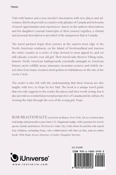 Told with humor and a true traveler's fascination with new places and adventure, this book provides a country wide glimpse of Canada and its bounty of travel opportunities and experiences. Based on the author's observations and his daughter's journal transcripts of their journey together, a vibrant and personal description is provided of the uniqueness that is Canada. The travel partners begin their journey at the eastern-most edge of the North American continent, on the Island of Newfoundland and traverse the entire country in a series of trips devised to most appeal to, and yet still educate, a twelve year old girl. Their travels take them to Viking ruins, historic North American battlegrounds essentially untaught in American history, arctic wildlife areas, museums, mountain scenery, and widely varied cities from major modern metropolises to habitations on the rim of the Arctic Circle. The reader is also left with the understanding that these lessons are also taught, with love, to Hope by her Dad. The book is a unique travel guide that not only suggests to the reader the places and sites worth seeing, but it also provides a wonderful personal perspective of Canada and its culture, by viewing the trips through the eyes of the young girl, Hope.