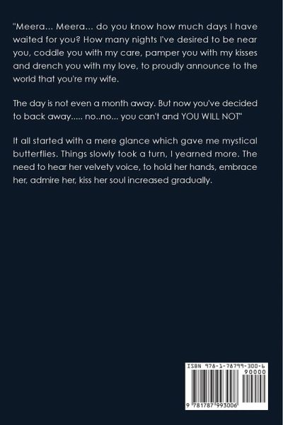 "Meera... Meera... do you know how much days I have waited for you? How many nights I've desired to be near you, coddle you with my care, pamper you with my kisses and drench you with my love, to proudly announce to the world that you're my wife. The day is not even a month away. But now you've decided to back away..... no..no... you can't and YOU WILL NOT" It all started with a mere glance which gave me mystical butterflies. Things slowly took a turn, I yearned more. The need to hear her velvety voice, to hold her hands, embrace her, admire her, kiss her soul increased gradually.