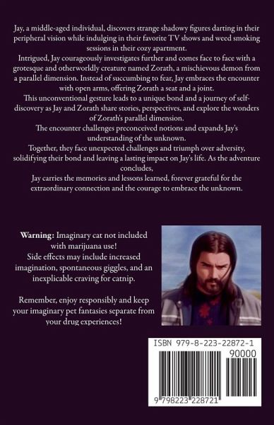 Jay, a middle-aged individual, discovers strange shadowy figures darting in their peripheral vision while indulging in their favorite TV shows and weed smoking sessions in their cozy apartment. Intrigued, Jay courageously investigates further and comes face to face with a grotesque and otherworldly creature named Zorath, a mischievous demon from a parallel dimension. Instead of succumbing to fear, Jay embraces the encounter with open arms, offering Zorath a seat and a joint. This unconventional gesture leads to a unique bond and a journey of self-discovery as Jay and Zorath share stories, perspectives, and explore the wonders of Zorath's parallel dimension. The encounter challenges preconceived notions and expands Jay's understanding of the unknown. Together, they face unexpected challenges and triumph over adversity, solidifying their bond and leaving a lasting impact on Jay's life. As the adventure concludes, Jay carries the memories and lessons learned, forever grateful for the extraordinary connection and the courage to embrace the unknown.