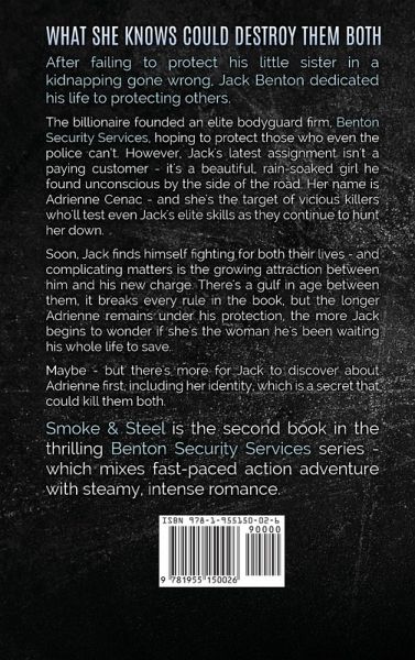 What she knows could destroy them both. After failing to protect his little sister in a kidnapping gone wrong, Jack Benton dedicated his life to protecting others. The billionaire founded an elite bodyguard firm, Benton Security Services, hoping to protect those who even the police can't. However, Jack's latest assignment isn't a paying customer - it's a beautiful, rain-soaked girl he found unconscious by the side of the road. Her name is Adrienne Cenac - and she's the target of vicious killers who'll test even Jack's elite skills as they continue to hunt her down. Soon, Jack finds himself fighting for both their lives - and complicating matters is the growing attraction between him and his new charge. There's a gulf in age between them, it breaks every rule in the book, but the longer Adrienne remains under his protection, the more Jack begins to wonder if she's the woman he's been waiting his whole life to save. Maybe - but there's more for Jack to discover about Adrienne first, including her identity, which is a secret that could kill them both. Smoke & Steel is the second book in the thrilling Benton Security Services series - which mixes fast-paced action adventure with steamy, intense romance.