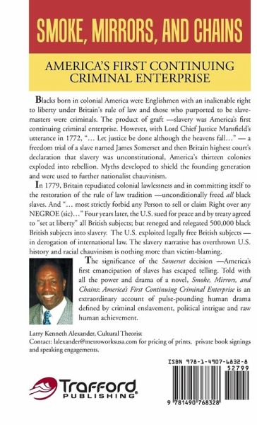Blacks born in colonial America were Englishmen with an inalienable right to liberty under Britain's rule of law and those who purported to be slavemasters were criminals. The product of graft -slavery was America's first continuing criminal enterprise. However, with Lord Chief Justice Mansfield's utterance in 1772, "... Let justice be done although the heavens fall..." - a freedom trial of a slave named James Somerset and then Britain highest court's declaration that slavery was unconstitutional, America's thirteen colonies exploded into rebellion. Myths developed to shield the founding generation and were used to further nationalist chauvinism. In 1779, Britain repudiated colonial lawlessness and in committing itself to the restoration of the rule of law tradition - unconditionally freed all black slaves. And "... most strictly forbid any Person to sell or claim Right over any NEGROE (sic)..." Four years later, the U.S. sued for peace and by treaty agreed to "set at liberty" all British subjects; but reneged and relegated 500,000 black British subjects into slavery. The U.S. exploited legally free British subjects - in derogation of international law. The slavery narrative has overthrown U.S. history and racial chauvinism is nothing more than victim-blaming. The significance of the Somerset decision - America'first emancipation of slaves has escaped telling. Told with all the power and drama of a novel, Smoke, Mirrors, and Chains: America's First Continuing Criminal Enterprise is an extraordinary account of pulse-pounding human drama defined by criminal enslavement, political intrigue and raw human achievement.