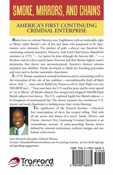 Blacks born in colonial America were Englishmen with an inalienable right to liberty under Britain's rule of law and those who purported to be slavemasters were criminals. The product of graft -slavery was America's first continuing criminal enterprise. However, with Lord Chief Justice Mansfield's utterance in 1772, "... Let justice be done although the heavens fall..." - a freedom trial of a slave named James Somerset and then Britain highest court's declaration that slavery was unconstitutional, America's thirteen colonies exploded into rebellion. Myths developed to shield the founding generation and were used to further nationalist chauvinism. In 1779, Britain repudiated colonial lawlessness and in committing itself to the restoration of the rule of law tradition - unconditionally freed all black slaves. And "... most strictly forbid any Person to sell or claim Right over any NEGROE (sic)..." Four years later, the U.S. sued for peace and by treaty agreed to "set at liberty" all British subjects; but reneged and relegated 500,000 black British subjects into slavery. The U.S. exploited legally free British subjects - in derogation of international law. The slavery narrative has overthrown U.S. history and racial chauvinism is nothing more than victim-blaming. The significance of the Somerset decision - America'first emancipation of slaves has escaped telling. Told with all the power and drama of a novel, Smoke, Mirrors, and Chains: America's First Continuing Criminal Enterprise is an extraordinary account of pulse-pounding human drama defined by criminal enslavement, political intrigue and raw human achievement.