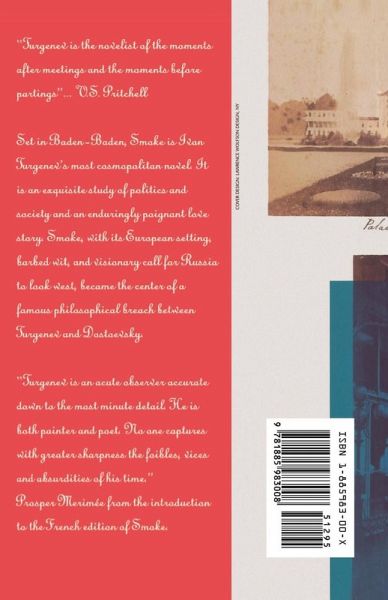 Set in Baden-Baden, Smoke is Ivan Turgenev's most cosmopolitan novel. It is an exquisite study of politics and society and an enduringly poignant love story. Smoke, with its European setting, barbed wit, and visionary call for Russia to look west, became the center of a famous philosophical breach between Turgenev and Dostoevsky.
