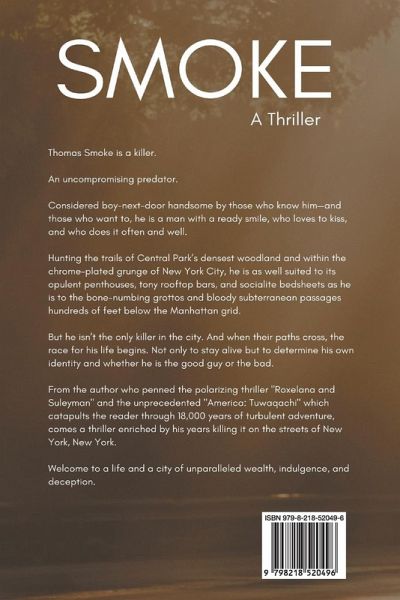 Thomas Smoke is a killer. An uncompromising predator. Considered boy-next-door handsome by those who know him-and those who want to, he is a man with a ready smile, who loves to kiss, and who does it often and well. Hunting the trails of Central Park's densest woodland and within the chrome-plated grunge of New York City, he is as well suited to its opulent penthouses, tony rooftop bars, and socialite bedsheets as he is to the bone-numbing grottos and bloody subterranean passages hundreds of feet below the Manhattan grid. But he isn't the only killer in the city. And when their paths cross, the race for his life begins. Not only to stay alive but to determine his own identity and whether he is the good guy or the bad. From the author who penned the polarizing thriller "Roxelana and Suleyman" and the unprecedented "America: Tuwaqachi" which catapults the reader through 18,000 years of turbulent adventure, comes a thriller enriched by his years killing it on the streets of New York, New York. Welcome to a life and a city of unparalleled wealth, indulgence, and deception.