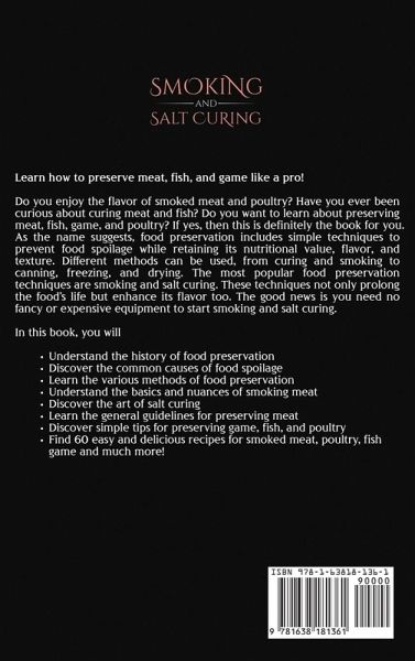 Learn how to preserve meat, fish, and game like a pro! Do you enjoy the flavor of smoked meat and poultry? Have you ever been curious about curing meat and fish? Do you want to learn about preserving meat, fish, game, and poultry? If yes, then this is definitely the book for you. As the name suggests, food preservation includes simple techniques to prevent food spoilage while retaining its nutritional value, flavor, and texture. Different methods can be used, from curing and smoking to canning, freezing, and drying. The most popular food preservation techniques are smoking and salt curing. These techniques not only prolong the food's life but enhance its flavor too. The good news is you need no fancy or expensive equipment to start smoking and salt curing. In this book, you will:Understand the history of food preservation Discover the common causes of food spoilage Learn the various methods of food preservation Understand the basics and nuances of smoking meat Discover the art of salt curing Learn the general guidelines for preserving meat Discover simple tips for preserving game, fish, and poultry Find 60 easy and delicious recipes for smoked meat, poultry, fish game, and much more! Are you eager to learn more? If yes, then what are you waiting for? Take the first step toward learning more about smoking and curing by grabbing your copy of this book today!