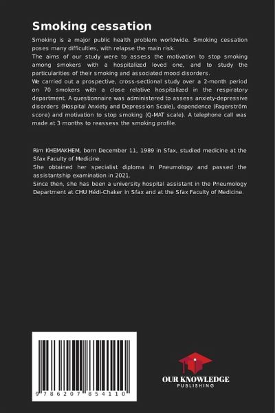 Smoking is a major public health problem worldwide. Smoking cessation poses many difficulties, with relapse the main risk.The aims of our study were to assess the motivation to stop smoking among smokers with a hospitalized loved one, and to study the particularities of their smoking and associated mood disorders.We carried out a prospective, cross-sectional study over a 2-month period on 70 smokers with a close relative hospitalized in the respiratory department. A questionnaire was administered to assess anxiety-depressive disorders (Hospital Anxiety and Depression Scale), dependence (Fagerström score) and motivation to stop smoking (Q-MAT scale). A telephone call was made at 3 months to reassess the smoking profile.