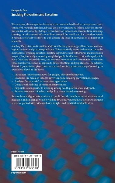 Chapter 1:From nicotine dependence to motivation to stop smoking.- 1.1Introduction: Denial and Delay.- 1.2Tobacco and nicotine.- 1.2.1What is Nicotine?.- 1.3Addiction and Nicotine addiction.- 1.4Nicotine withdrawal.- 1.5How to measure nicotine dependence.- 1.5.1Fagerstrom Tolerance Questionnaire.- 1.5.2Fagerstrom Test for Nicotine Dependence.- 1.6Motivation to stop smoking.- Chapter 2:State of the art of smoking habits in the world.- 2.1 Introduction: the tobacco epidemic.- 2.2 Data on incidence, prevalence, by gender, age-groups, ethnic groups.- 2.2.1 Tobacco consumption by gender and adults in the six major regions of the world.- 2.2.2 Tobacco consumption by adolescents in the six major regions of the world.- 2.2.3 Ethnic groups.- 2.3 Passive smoking.- 2.3.1 Secondhand smoking.- 2.3.2 Thirdhand smoking.- Chapter 3:Smoking-related diseases epidemiology.- 3.1Introduction.- 3.2 Cardiovascular diseases.- 3.2.1 Coronary Heart Disease.- 3.2.2 Hypertension.- 3.2.3 Cerebro-Vascular Disease.- 3.2.4 Aortic Aneurism.- 3.3 Respiratory diseases.- 3.3.1 Chronic Obstructive Pulmonary Disease (COPD).- 3.3.2 Chronic Bronchitis.- 3.3.3 Emphysema.- 3.3.4 Asthma.- 3.4 Cancers: main smoking-related cancers.- 3.4.1 Lung Cancer.- 3.4.2 Cancer of the Larynx.- 3.4.3 Cancer of the Oesophagus.- 3.4.4 Lower urinary tract.- 3.4.5 Pancreatic Cancer.- 3.4.6 Stomach Cancer.- 3.4.7 Breast Cancer.- 3.4 Other diseases.- 3.4.1 Acne.- 3.4.2 Low Birth Weight.- 3.4.3 Sudden Infant Death Syndrome (SIDS).- 3.4.4. Maculophaty.- 3.4.5 Smoking related allergy.- 3.4.6 Early Menopause.- Chapter 4 Smoking -related cancer epidemiology.- 4.1 Introduction.- 4.2 Cancers: main smoking-related cancers.- 4.3 Lung Cancer.- 4.4 Cancer of the Larynx.- 4.5 Cancer of the Esophagus.- 4.6 Lower urinary tract.- 4.7Pancreatic Cancer.- 4.8 Stomach Cancer.- 4.9 Breast Cancer.- Chapter 5 Classical determinants of smoking initiation.-5.1Introduction.-5.2 The role of the family.- 5.3The peer.-5.3.1PeerSocialization.- 5.3.2 Peer Selection.- 5.4The society.- 5.5Personal characteristics.- Chapter 6: Smoking prevention 6.1Introduction -Smoking prevention at school.- 6.1.1.Data on incidence and prevalence among adolescents.- 6.1.2Smoking prevention interventions at school.- 6.1.3Community interventions.-6.1.4Evidence-based recommendations and guidelines.- 6.2Smoking prevention in the workplace-Introduction.- 6.2.1Data on incidence and prevalence among workers.- 6.2.2Workplace interventions for smoking cessation.- 6.2.3Smoking-free workplace legislation.- 6.3Smoke free legislation.- Chapter 7.- 7.1Mass Media campaigns.- 7.1.1Mass Media campaigns definition.- 7.1.2The use of mass media campaigns in Public Health.- 7.1.3Identifying the target audience.- 7.1.4Characteristics of the message: design, contents, emotional appeal and source.- 7.1.5Dissemination strategy and channel characteristics.- 7.2Mass Media campaigns in smoking prevention strategies.- 7.2.1Formative research, theory and evaluation.- 7.2.2 Audience segmentation.- 7.2.3Message appeal, contents, format and tone.- 7.2.4Channel selection and message placement.- 7.3Overview of the theoretical approaches of tobacco control mass media campaigns.- 7.3.1Input-output persuasion model.- 7.3.2Health beliefs model.- 7.3.3Theory of reasoned action (Theory of planned behavior).- 7.3.4Integrative model of behavior change.- 7.3.5Trans-theoretical model (or State of Changes).- 7.3.6Social learning (cognitive) theory (Bandura A. 1977).- 7.4Mass Media Campaigns: overview of scientific evidence.- 7.4.1Overview of scientific literature.- 7.4.2Effectiveness, opportunities and shortcomings of mass media campaigns in preventing smoking initiation.- 7.4.3Characteristics of Effective Mass Media Campaigns.- 7.4.4Expert conclusions on Mass Media Public Education Campaigns.- 7.4.5Identified research gaps.- 7.5Mass Media Campaigns: evidence into practice.- 7.5.1Main umbrella organizations involved (e.g.WHO,EU. OECD).- 7.5.2TheWorld Health Organization.- 7.5.3The European community.- 7.5.4Main National Public Health Agencies, including guidance/best practices delivery agencies.- 7.6Smoking Prevention: Mass Media campaigns worldwide.- 7.6.1Worldwide Mass Media campaigns targeted at general population and at specific demographic groups .- Chapter 8:How to tackle smoking at the population level.- 8.1The Tobacco free Framework.- 8.2EU legislation on tobacco.- 8.3Package advertising.- Chapter 9:Smoking among health professionals .- 9.1Introduction.- 9.2Smoking among Medical doctors.- 9.3Smoking Prevalence among Nurses.- 9.4Public awareness about smoking habits among Health Professionals.- 9.5Smoking among health profession students.- Chapter 10:Basic principles of smoking cessation techniques.- 10.1Introduction.- 10.2Transtheoretical approach Model (TTM).- 10.2.1Precontemplation.- 10.2.2Contemplation.-10.2.3Preparation.- 10.2.4Action.- 10.2.5Maintenance.- 10.3What is counseling?.- 10.3.1Counseling for Smoking Cessation.- 10.3.2Administrative aspects of counseling.- 10.4The 5 A's and 3A's approaches.- 10.4.15A's.- 10.4.23A's.- 10.5The evidence of counseling.- 10.6Medication for drug cessation 10.6.1First-line medications.- 10.6.1.1Nicotine Replacement Medications.- 10.6.1.2 Products not containing Nicotine.- 10.6.1.3The evidence of efficacy of first-line medications.- Chapter 11.- Smoking cessation among different settings.- 11.1Smoking cessation in the general population.- 11.2Smoking cessation in the clinical setting.- 11.3Smoking cessation in the workplace.- 11.4Smoking cessation among healthcare professionals.- 11.4.1Introduction.- 11.4.2The key role of health care providers in smoking cessation.- 11.4.3Prevalence of tobacco consumption among health care professionals.- 11.4.4Implementation of smoking cessation strategies: a review of current scientific literature.- 11.4.5Compared efficacy of various smoking cessation interventions.- 11.4.6Conclusions.- Chapter 12.-12.1Introduction.- 12.2The Allen Carr book on "How to quit smok