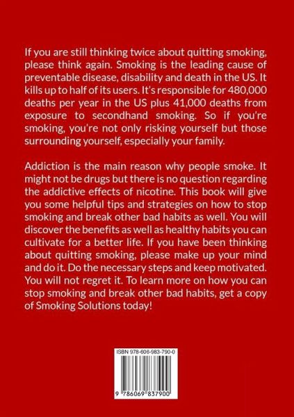 Smoking Solutions: The Ultimate Guide on How to Stop Smoking, Discover Effective Tips on How to Break Your Smoking Habit and Revitalize Your Body If you are still thinking twice about quitting smoking, please think again. Smoking is the leading cause of preventable disease, disability, and death in the US. It kills up to half of its users. It's responsible for 480,000 deaths per year in the US plus 41,000 deaths from exposure to secondhand smoking. So if you're smoking, you're not only risking yourself but those surrounding yourself, especially your family. Addiction is the main reason why people smoke. It might not be drugs but there is no question regarding the addictive effects of nicotine. This book will give you some helpful tips and strategies on how to stop smoking and break other bad habits as well. You will discover the benefits as well as healthy habits you can cultivate for a better life. This book will teach you about the following topics: Beating Nicotine Basics Nicotine Replacements Using Self-Hypnosis Using Support Groups Using Nutrition Basics to Breaking Old Habits Nutritional Tips for Conquering Ciggy Cravings Benefits of Meditation Affirmations for Abstinence Healthy Habits for a Better Life Importance of Quitting Smoking Today Some people think smoking is an issue they can just deal with later but when you're smoking, time is actually not on your side. Every cigarette you smoke means you are knowingly putting chemicals that are known to cause cancer inside your body. And not just YOUR body but those surrounding you as well. If you have been thinking about quitting smoking, please make up your mind and do it. Do the necessary steps and keep motivated. You will not regret it. To learn more on how you can stop smoking and break other bad habits, scroll up and click "add to cart" now.