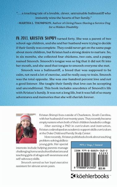 In 2013, Kristan Shimpi turned forty. She was a parent of two school-age children, and she and her husband were trying to decide if their family was complete. They could never get on the same page about more children, but Kristan had a strong desire to nurture. So, in six months, she collected four chickens, two cats, and a puppy named Smooch. Smooch's tongue was so big that it did not fit into her mouth, and she used that tongue to smooch everyone she met. Smooch was a bullmastiff, a breed that was supposed to be calm, not need a lot of exercise, and be really easy to train. Smooch was the total opposite. She was one-hundred-percent love and not a good listener. She taught their family that love can be accepting and unconditional. This book includes anecdotes of Smooch's life with Kristan's family. It was not a long life, but it was full of so many adventures and memories that she will cherish forever.