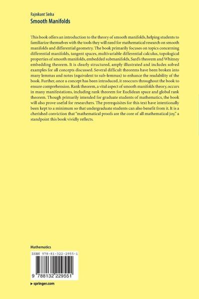 This book offers an introduction to the theory of smooth manifolds, helping students to familiarize themselves with the tools they will need for mathematical research on smooth manifolds and differential geometry. The book primarily focuses on topics concerning differential manifolds, tangent spaces, multivariable differential calculus, topological properties of smooth manifolds, embedded submanifolds, Sard's theorem and Whitney embedding theorem. It is clearly structured, amply illustrated and includes solved examples for all concepts discussed. Several difficult theorems have been broken into many lemmas and notes (equivalent to sub-lemmas) to enhance the readability of the book. Further, once a concept has been introduced, it reoccurs throughout the book to ensure comprehension. Rank theorem, a vital aspect of smooth manifolds theory, occurs in many manifestations, including rank theorem for Euclidean space and global rank theorem. Though primarily intended for graduate studentsof mathematics, the book will also prove useful for researchers. The prerequisites for this text have intentionally been kept to a minimum so that undergraduate students can also benefit from it. It is a cherished conviction that "mathematical proofs are the core of all mathematical joy," a standpoint this book vividly reflects.