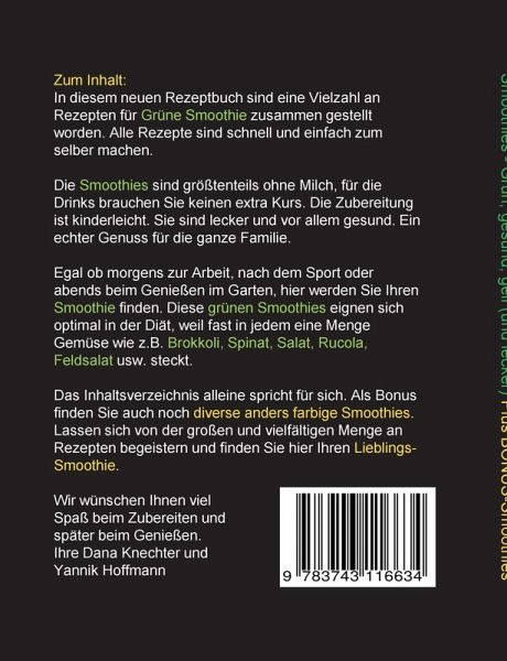 In diesem neuen Rezeptbuch sind eine Vielzahl an Rezepten für Grüne Smoothie zusammen gestellt worden. Alle Rezepte sind schnell und einfach zum selber machen.Die Smoothies sind größtenteils ohne Milch, für die Drinks brauchen Sie keinen extra Kurs. Die Zubereitung ist kinderleicht. Sie sind lecker und vor allem gesund. Ein echter Genuss für die ganze Familie.Egal ob morgens zur Arbeit, nach dem Sport oder abends beim Genießen im Garten, hier werden Sie Ihren Smoothie finden. Diese grünen Smoothies eignen sich optimal in der Diät, weil fast in jedem eine Menge Gemüse wie z.B. Brokkoli, Spinat, Salat, Rucola, Feldsalat usw. steckt.Das Inhaltsverzeichnis alleine spricht für sich. Als Bonus finden Sie auch noch diverse anders farbige Smoothies.Lassen sich von der großen und vielfältigen Menge an Rezepten begeistern und finden Sie hier Ihren Lieblings-Smoothie.Wir wünschen Ihnen viel Spaß beim Zubereiten und später beim Genießen.Ihre Dana Knechter und Yannik Hoffmann