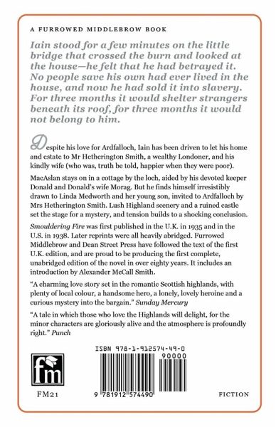 Iain stood for a few minutes on the little bridge that crossed the burn and looked at the house—he felt that he had betrayed it. No people save his own had ever lived in the house, and now he had sold it into slavery. For three months it would shelter strangers beneath its roof, for three months it would not belong to him. Despite his passionate love for Ardfalloch, Iain has been driven to let his home and estate to Mr Hetherington Smith, a wealthy London businessman, and his kindly wife (who was, truth be told, happier when they were poor). MacAslan stays on in a cottage by the loch, aided by his devoted keeper Donald and Donald’s wife Morag. But he finds himself irresistibly drawn to Linda Medworth and her young son, invited to Ardfalloch by Mrs Hetherington Smith. Lush Highland scenery and a ruined castle set the stage for a mystery, and tension builds to a shocking conclusion. Smouldering Fire was first published in the U.K. in 1935 and in the U.S. in 1938. Later reprints were all heavily abridged. For our reprint, Furrowed Middlebrow and Dean Street Press have followed the text of the first U.K. edition, and are proud to be producing the first complete, unabridged edition of the novel in eighty years. "A charming love story set in the romantic Scottish highlands, with plenty of local colour, a handsome hero, a lonely, lovely heroine and a curious mystery into the bargain." Sunday Mercury "A tale in which those who love the Highlands will delight, for the minor characters are gloriously alive and the atmosphere is profoundly right." Punch