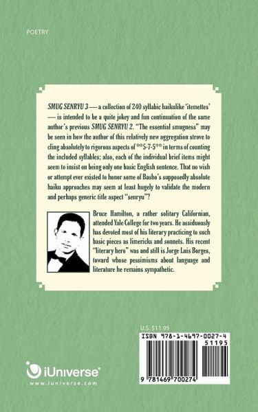 SMUG SENRYU ~~3~~ -- a collection of 240 syllabic haikulike 'itemettes' -- is intended to be a quite jokey and fun continuation of the same author's previous SMUG SENRYU ~~2.~~ "The essential smugness" may be seen in how the author of this relatively new aggregation strove to cling absolutely to rigorous aspects of **5-7-5** in terms of counting the included syllables; also, each of the individual brief items might seem to insist on being only one basic English sentence. That no wish or attempt ever existed to honor some of Basho's supposedly absolute haiku approaches may seem at least hugely to validate the modern and perhaps generic title aspect "senryu"?