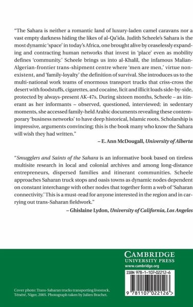 Smugglers and Saints of the Sahara describes life on and around the contemporary border between Algeria and Mali, exploring current developments in a broad historical and socioeconomic context. Basing her findings on long-term fieldwork with trading families, truckers, smugglers and scholars, Judith Scheele investigates the history of contemporary patterns of mobility from the late nineteenth century to the present. Through a careful analysis of family ties and local economic records, this book shows how long-standing mobility and interdependence have shaped not only local economies, but also notions of social hierarchy, morality and political legitimacy, creating patterns that endure today and that need to be taken into account in any empirically-grounded study of the region.