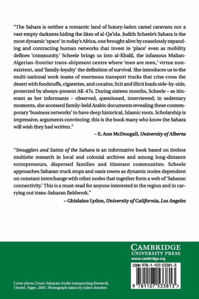 Smugglers and Saints of the Sahara describes life on and around the contemporary border between Algeria and Mali, exploring current developments in a broad historical and socioeconomic context. Basing her findings on long-term fieldwork with trading families, truckers, smugglers and scholars, Judith Scheele investigates the history of contemporary patterns of mobility from the late nineteenth century to the present. Through a careful analysis of family ties and local economic records, this book shows how long-standing mobility and interdependence have shaped not only local economies, but also notions of social hierarchy, morality and political legitimacy, creating patterns that endure today and that need to be taken into account in any empirically-grounded study of the region.
