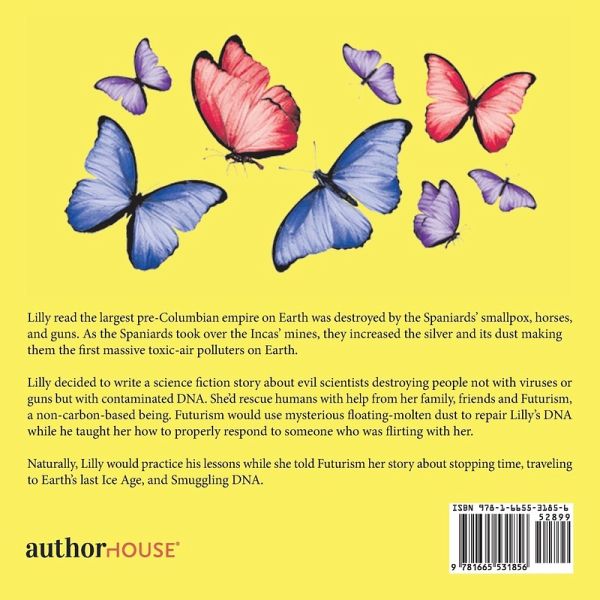 Lilly read the largest pre-Columbian empire on Earth was destroyed by the Spaniards' smallpox, horses, and guns. As the Spaniards took over the Incas' mines they increased the silver and its dust making them the first massive toxic-air polluters on Earth. Lilly decided to write a science fiction story about evil scientists destroying people not with viruses or guns but with contaminated DNA. She'd rescue humans with help from her family, friends and Futurism, a non-carbon-based being. Futurism would use mysterious floating-molten dust to repair Lilly's DNA while he taught her how to properly respond to someone who was flirting with her. Naturally, Lilly would practice his lessons while she told Futurism her story about stopping time, traveling to Earth's last ice age, and Smuggling DNA.