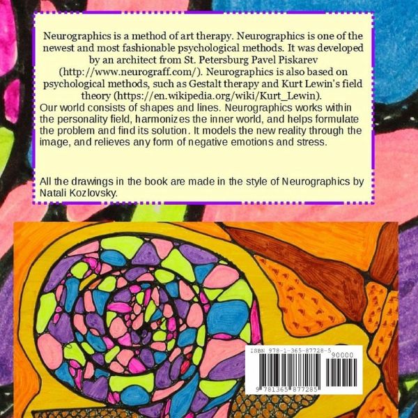 Neurographics is a method of art therapy. Neurographics is one of the newest and most fashionable psychological methods. It was developed by an architect from St. Petersburg Pavel Piskarev (http://www.neurograff.com/). Neurographics is also based on psychological methods, such as Gestalt therapy and Kurt Lewin's field theory (https://en.wikipedia.org/wiki/Kurt_Lewin). Our world consists of shapes and lines. Neurographics works within the personality field, harmonizes the inner world, and helps formulate the problem and find its solution. It models the new reality through the image, and relieves any form of negative emotions and stress. All the drawings in the book are made in the style of Neurographics by Natali Kozlovsky.