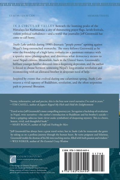 In a circular valley beneath the looming peaks of the Himalaya lies Kathmandu, Nepal. It's a city of shimmering prayer flags, sacred cows, lavish festivals, and violent political turbulence—and a world that journalist Jeff Greenwald has come to call home. Snake Lake unfolds during 1990's dramatic "people power" uprising against Nepal's long–entrenched monarchy. The story follows Greenwald as he wins the friendship of a high lama who reveals the pillars of Tibetan Buddhism; embarks on a passionate romance with a spunky but curiously unlucky news photographer; and discovers what democracy means to rural Nepali citizens—all while covering the revolution for a major American newspaper. Meanwhile, back in the U.S., Greenwald's brilliant but troubled younger brother descends into a deepening depression. The author is forced to choose between witnessing Nepal's long–overdue revolution and reconnecting with an alienated brother in desperate need of help. Snake Lake is primarily a memoir (though the roles of several characters have been recast). Focused on the life–changing events that unfolded during one calamitous spring, the book weaves a vivid tapestry of Buddhism, revolution, and the often serpentine paths to personal liberation.