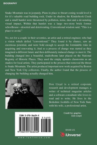 Snake Mountain was in jeopardy. Plans in place to thwart zoning would level it for it's valuable road building rock. Under its shadow, the Kinderhook Creek and a small hamlet were threatened by pollution, noise, dust and a devastating visual impact. Within that hamlet was a large two-story brick former schoolhouse - deserted and deteriorating. Conventional wisdom said, 'This is a place to avoid." No, not for a couple in their seventies, an artist and a retired engineer, who had a vision which defied 'conventional." They found it by chance, saw an enormous potential, and were bold enough to accept the formidable risks in acquiring and renovating it. And so a process of change was started as they imagined a different future and then deliberately induced change to meet it. The building changed into a beautiful, studio/home later placed on the National Registry of Historic Places. They used the empty upstairs classrooms as art studios for local artists. They participated in the process that removed the threat to Snake Mountain. The artist produced important new work acquired by Boston and New York City collectors. Finally, the author found that the process of changing the building actually changed him.