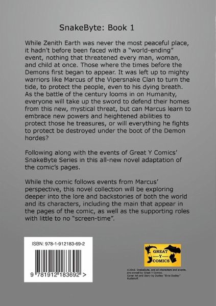 While Zenith Earth was never the most peaceful place, it hadn't before been faced with a "world-ending" event, nothing that threatened every man, woman, and child at once. Those where the times before the Demons first began to appear. It was left up to mighty warriors like Marcus of the Vipersnake Clan to turn the tide, to protect the people, even to his dying breath. As the battle of the century looms in on Humanity, everyone will take up the sword to defend their homes from this new, mystical threat, but can Marcus learn to embrace new powers and heightened abilities to protect those he treasures, or will everything he fights to protect be destroyed under the boot of the Demon hordes? Following along with the events of Great Y Comics' SnakeByte Series in this all-new novel adaptation of the comic's pages. While the comic follows events from Marcus' perspective, this novel collection will be exploring deeper into the lore and backstories of both the world and its characters, including the main that appear in the pages of the comic, as well as the supporting roles with little to no "screen-time".