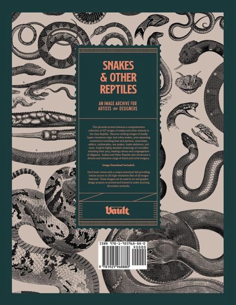 This pictorial archive features a comprehensive collection of 327 images of snakes and other animals in the class Reptilia. Discover striking images of deadly hyper-venomous viper and cobra snakes, prey squeezing constrictors including boas and pythons, anacondas, adders, rattlesnakes, sea snakes, snake skeletons, and more. Explore highly detailed renderings of crocodiles attacking their prey, basking caiman and congregations of alligators. Snakes and Other Reptiles also showcases a diverse and extensive range of lizard and turtle imagery. Features: Each book comes with a unique download link providing instant access to high-resolution files of all 327 images featured. These images can be used in art and graphic design projects or printed and framed to make stunning decorative artworks. We promise you will be impressed with this pictorial archive. About the author: This book was curated and authored by the creative director of Vault Editions, Kale James. Kale has published over 30 acclaimed books within the art design space and has worked with brands including Nike, Samsung, Adidas and Rolling Stone. Kale's artwork is published in numerous titles, including No Cure, Semi-Permanent, Vogue and more. This collection of vintage illustrations is an essential resource for all artists, collage artists, graphic designers, illustrators, printmakers and tattoo artists looking to take their artwork to the next level. Download your files now and start creating amazing artwork today!