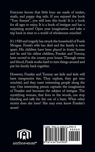 Everyone knows that little boys are made of snakes, snails, and puppy dog tails. If you enjoyed the book "Tom Sawyer", you will love this book! It is a book for all ages to enjoy. It is a book of intrigue and has a surprising secret! Open your imagination and take a trip back in time to a world of wholesome mischief. It's 1920 and tragedy has struck the household of Frank Morgan. Frank's wife has died and the family is torn apart. His children have been placed in foster homes and he and his oldest children, Frankie and Tommy, have moved to the county poor house. Through sweat and blood, Frank works hard to turn things around and put his family back together. However, Frankie and Tommy are kids and kids will have in expensive fun. They explore, they get into mischief, and they meet interesting people along the way. One interesting person captures the imagination of Frankie and becomes the subject of intrigue. The mystifying woman, that lives in the woods, can stop bleeding and talk the fire out of a burn. What other secrets does she have? She may even know Frankie's secret!